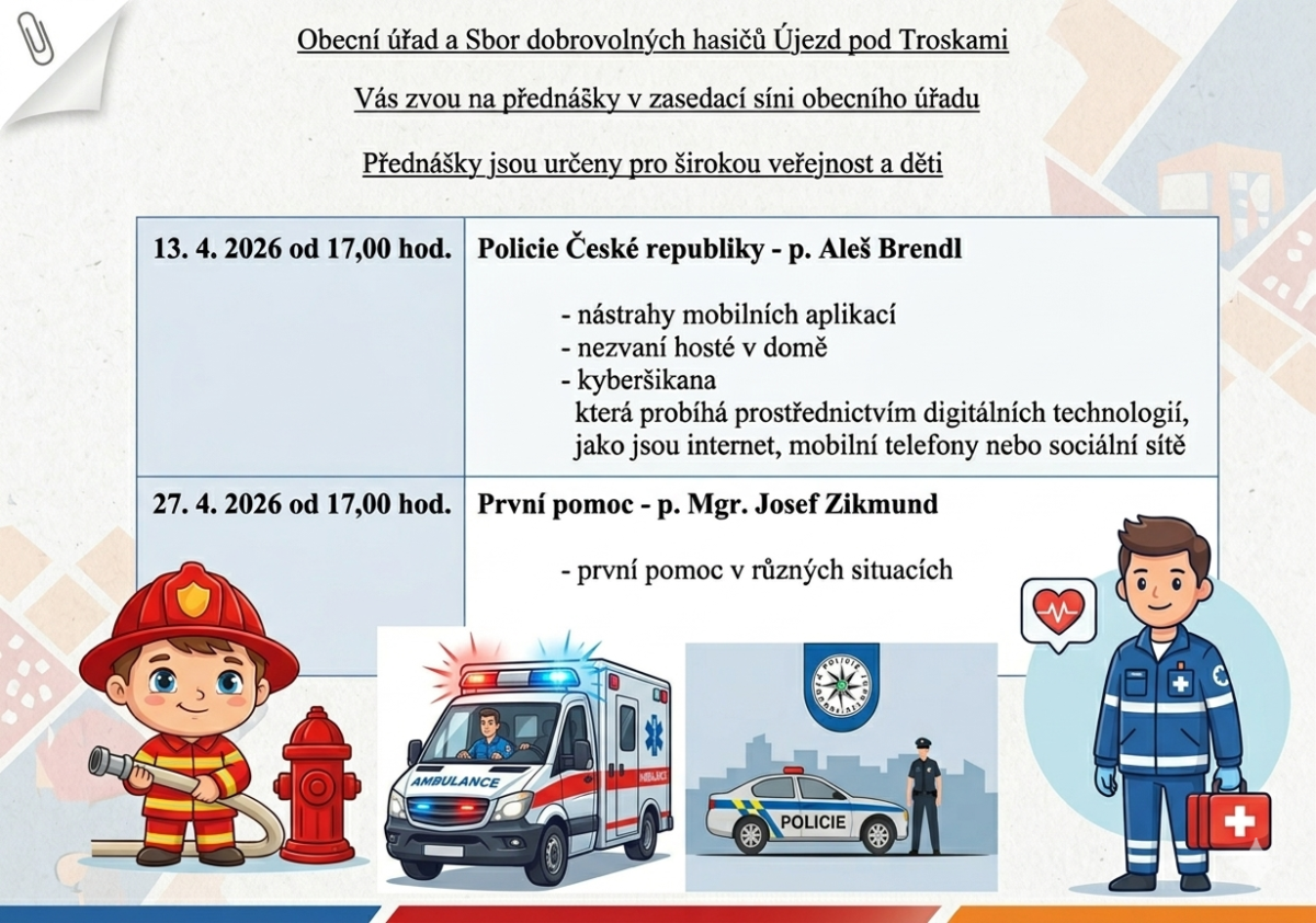 Připomenutí – přednáška První pomoc Publikováno 27.04.2026 | Autor: Obecní úřad Újezd pod Troskami Dobrý den. Připomínám dnešní přednášku.